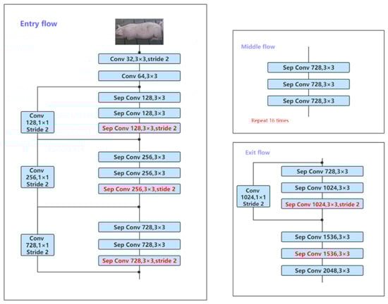 DeepLabv3+’s network structure diagram, which includes three parts: entry flow, middle flow, and exit flow.