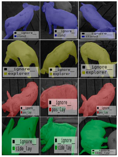 Jiazhen Han sought to solve the problem of multi-target recognition [12], while Dan Li proposed that the establishment of a standard dataset for pigs is necessary and would have far-reaching significance [33]. Unlike in other studies, the target of this work was a group of pigs, and this study created the world’s first human-annotated pig-posture-recognition dataset. After an improved combined training method involving target detection and semantic segmentation, this study obtained more accurate recognition than related research and solved the problems related to the difficulty of removing background factors and multi-target recognition.