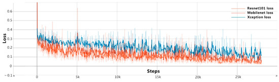 This study analyzed a classic model based on previous experience gained from many experiments. In DeepLab training, the weights are initialized with the pre-trained weights of Resnet-101 and Xception, respectively, the output step is 16, the loss function uses cross-entropy loss (ce), the batch size is 4, the Lr is 0.01, the poly learning rate drops, the momentum is 0.9, and the decay is 0.0005.