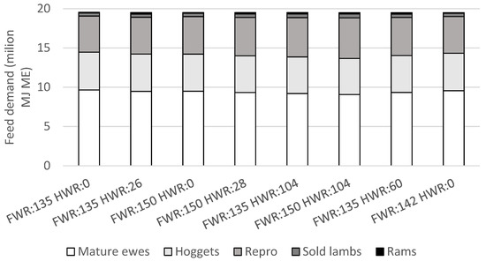 Annual feed demand (metabolisable energy) of mature ewes (2 to 6 years old), hoggets (1 year old ewes), reproduction (gestation and lactation of all lambs), sold lambs prior to leaving the farm, and rams, for scenarios with combinations of varying weaning rates (lambs weaned per ewe which was presented for breeding) of mature ewes (FWR) and hoggets (HWR).