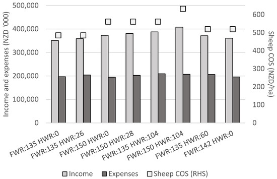 The sheep enterprise COS achieved in the modelled scenarios ranged from NZD 485/ha to NZD 632/ha (Figure 4). The average EBITR for this type of farm system in the 2019/20 production year was between NZD 500/ha and NZD 600/ha [43]. Therefore, the COS levels estimated in this analysis were sufficiently similar that it could be assumed the scenarios were representative of the farm system in New Zealand in the 2019/20 production year.