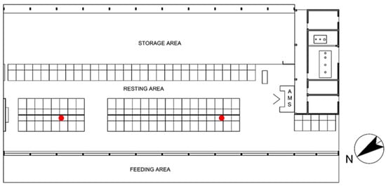 Layout of the case study barn (AMS: Automatic Milking System; ● position of the two thermo-hygrometer data loggers).