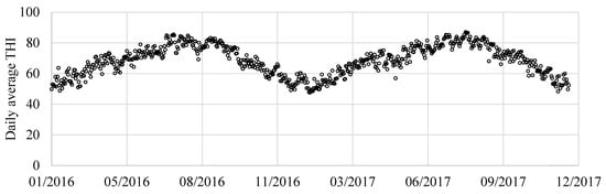 Then, the daily average THI was calculated for the two thermo-hygrometer sensors. The values of the two showed a maximum difference of only 0.8, confirming the environmental homogeneity in the barn. In the study, the mean values of THI obtained by the two thermo-hygrometers were considered. They are showed in Figure 2.
