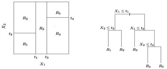 and are sample features, is the i-th region of the features’ space. Right panel shows the tree corresponding to the partition. The variable t is a generic parameter.