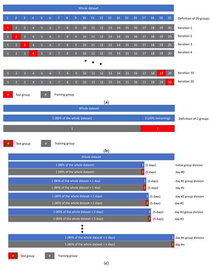 Division of the datasets for the different scenarios. (a) Scheme of the 20-fold cross-validation procedure used in scenario A. (b) Scheme of the scenario B. (c) Scheme of the scenario C.
