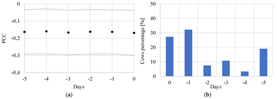 Correlation between milk yield and climatic data. (a) Pearson correlation coefficient: average values and average ± St. Dev. values. (b) Percentage distribution of cows vs. day with highest negative effects on milk production (i.e., the day with lower PCC for the single animal).