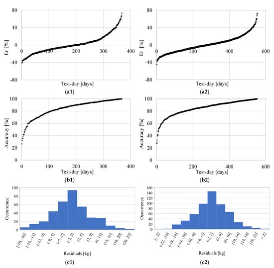 Main results obtained for scenario A for two representative cows where (1) represents animal #226 and (2) animal #243. (a) Relative error Er of the daily yield in ascending order; (b) accuracies of the daily yield predictions in ascending order; (c) histogram representation of the residuals of the predictions.
