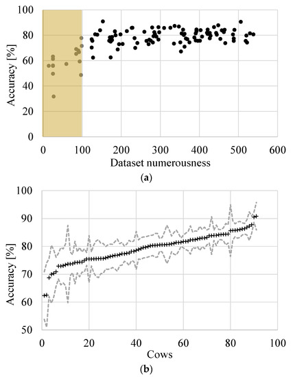 Main results obtained for scenario A for the 91 cows of the study. (a) Median accuracy for each cow vs. dataset numerousness; (b) median accuracy ± standard deviation for each cow sorted ascendingly.