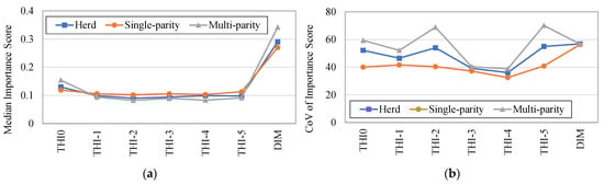 Moreover, the most important values of the diagram are summarized in Table 1, collecting, for each independent variable (feature), the minimum value, the maximum value, the median value, the standard deviation value, and the coefficient of variation (CoV) value obtained for the IS. In Table 1, as expected, it appears to be clear as the DIM has the highest score, with a median IS = 0.29. Then, THI0, i.e., the average THI of the day to predict (median IS = 0.13), whereas the other features (THI−1–THI−5) have comparable median ISs, ranging from 0.090 to 0.099. The minimum and maximum values recorded for the different features circumscribe large ranges, confirming the high cow-to-cow variability of the RFMs. The features with the highest median IS values are, at the same time, those associated with highest CoV values.