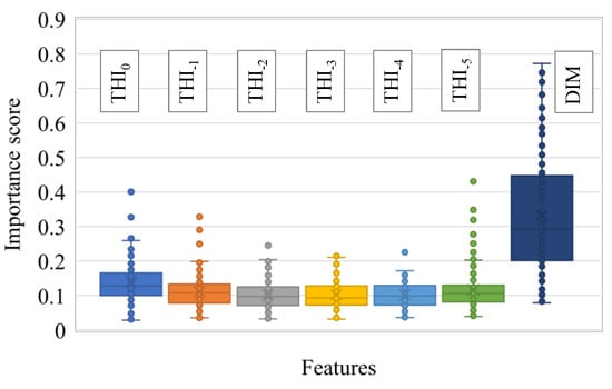 The DIM has the highest importance scores, with a median IS = 0.29. Then, THI0, i.e., the average THI of the day to predict, has a median of IS = 0.13, whereas the other features (THI−1–THI−5) have comparable median ISs ranging from 0.093 to 0.11. Moreover, the feature with highest median IS value (DIM) is affected by the highest variability in the IS values (i.e., highest values of CoV).