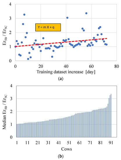 As a representative example, Figure 12a displays, for a generic cow (#248), the evolution of the values of the ratio Er5B/Er5C, between the values of Er5 calculated in an analogous way for the scenarios B and C, respectively. As the figure shows, the values are rather scattered, but the general tendency of the trend is to increase with respect to the value recorded at the beginning of the series (i.e., for a value of the training dataset increase equal to 0, the ratio must be equal to 1). The positive effect during the time can be evaluated as a whole and qualitatively by the slope (m) of the best fitting linear equation. If the value of m is considerably higher/lower than 0, it means that the model is improving/worsening its accuracy. Instead, values of m around 0 indicate a substantial stability of the accuracy of the predictions. This parameter, even if very intuitive, does not have a physical explanation and cannot be related in a simple way to an increase in accuracy. Therefore, for practical reasons, the increase in the predictive capability of the models has been numerically evaluated in terms of median ratio Er5B/Er5C for each cow (see Figure 12b). Globally, the median ratio for the different cows goes from 1.02 to 3.35, with a mean value for the 91 cows equal to 1.64. Then, the augment in knowledge of the models, as expected, can increase, in a significant way, the accuracy of the predictions.