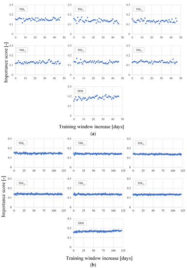 Trends of each importance score vs. training window increase for cows (a) #26 and (b) #85.