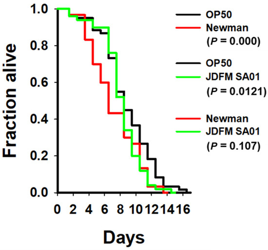 The survival rate of C. elegans worms infected with S. aureus JDFM SA01. Survival statistics: S. aureus JDFM SA01-conditioned nematodes compared with worms feeding on S. aureus Newman and OP50 control strains. Statistical analysis was performed using Kaplan-Meier method.