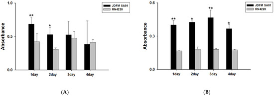 Evaluation of the biofilm formation ability of S. aureus JDFM SA01 strains. (A) 0.5× LB broth, (B) 0.1× LB broth. Statistical significance was analyzed with a t-test. Asterisks indicate a statistically significant difference compared with RN4220 (* p < 0.05, ** p < 0.01).