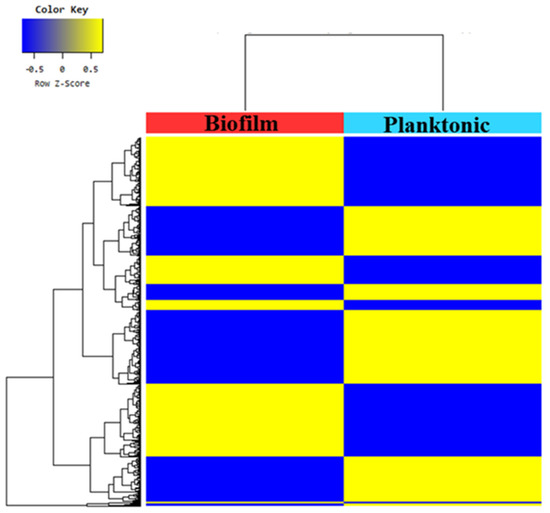 The cDNA fragment obtained through RNA-seq was mapped using a genomic DNA reference. Among 29,473,682 reads of planktonic cells, 28,548,736 reads were mapped, the remaining 860,642 reads were not mapped, and 64,304 reads were removed due to multiple mapping. In biofilms, 30,074,628 reads out of 30,942,842 reads were mapped. The remaining 822,706 reads were not mapped, and 45,508 reads were removed due to multiple mapping. To check the data quality of known genes from read mapping, genes with a count value of 0 in more than one sample were excluded from the analysis. A total of 51 genes were excluded from planktonic cells, and 73 genes were excluded from biofilms. After the statistical analysis was performed on 2506 genes, excluding 124 out of 2630 genes, differentially expressed genes were analyzed.