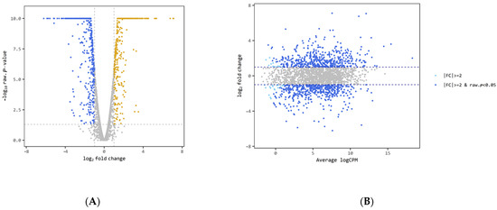 Differential expression level of the biofilm vs. planktonic identified by | log2 (fold change)| > 1 and adjusted p-value < 0.05. (A) volcano plot, (B) smear plot.