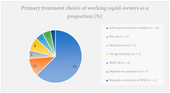 Sixty-two per cent (n = 23) of owners relied first upon themselves to treat their animals with home remedies or traditional medicine. Of these, 78 per cent (n= 18) would go on to seek help from a doctor (private, government, or NGO-based) if their own treatment did not achieve the desired result. Conversely, five per cent (n = 2) of owners stated that they never used home remedies (Figure 2). The majority of those self-treating their animals expressed confidence in their knowledge of their animals and how to treat them. However, few methods of treatment were the same across different animal owners, even within small communities.