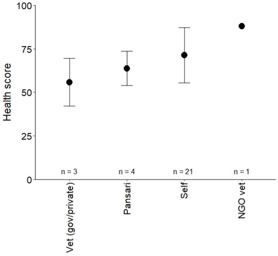 When considering each treatment type separately, the one owner whose primary treatment choice was an NGO veterinarian (n = 1) had the best welfare in terms of health, though more owners selecting this option would be needed to verify that this is the norm. Owners whose primary treatment choice was a veterinarian (governmental or private) (n = 3) had equids with the poorest welfare, which was, on average, 15 per cent lower in terms of health score than owners who chose to self-treat (Figure 3).