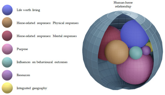 Image of the conceptual model using a theoretical human–horse relationship to represent themes and their interaction at a cross-section in time. The sphere size does not represent quantification as the relative importance of each theme is unique for a particular human and horse at a particular point in time.