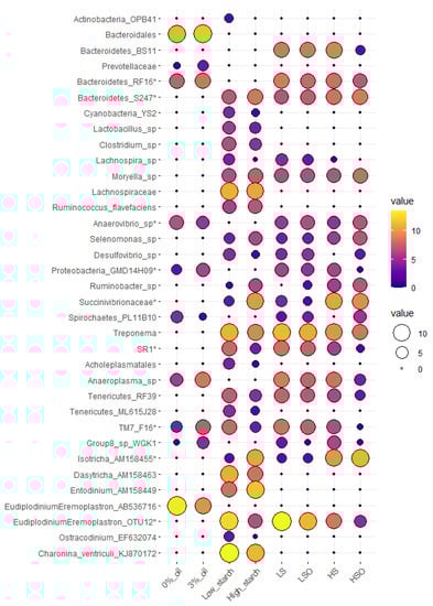 Mean abundance plot of microbial taxa that were significantly (p < 0.05) affected by oil, starch, or were significantly different in dietary pairwise comparisons. Microbial taxa tested are represented on Y-axis, while treatment groups tested are presented on the X-axis. Microbial values are presented as CSS normalized and log-transformed abundance data. An increase in bubble size and transition from purple to yellow color corresponds with the increase in abundance of a particular OTU. Microbial taxa with (*) are significant after FDR correction (FDR < 0.05).