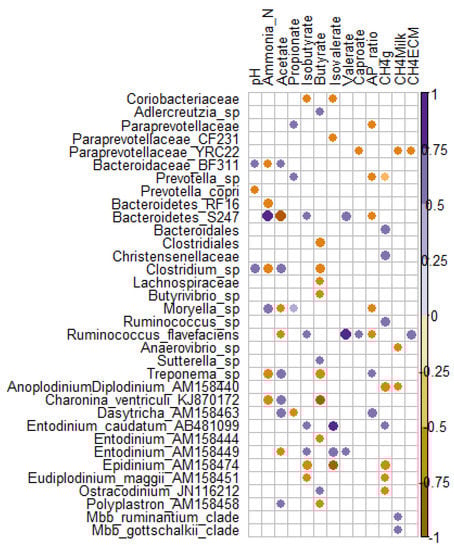 Spearman correlation plot between microbial taxa and rumen fermentation parameters. Only significant (p < 0.05) positive (purple) and negative (orange) correlations are presented.