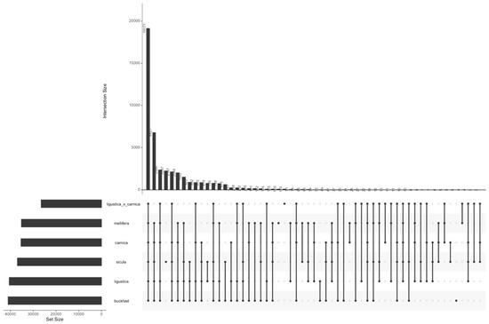 The distribution across subspecies of SNPs in the filtered dataset is shown in Figure 2. In total, 42.78% of the selected SNPs are shared by all the subspecies. The A.m. sicula exhibits the highest number of private SNPs (2287), followed by the A.m. mellifera (120) and A.m. ligustica × A.m. carnica (105). This confirms that A.m. mellifera and especially A.m. sicula differ from the other subspecies. This result is in agreement with the subsequent genomic analyses and the fact that they derive from two different evolutionary lineages.