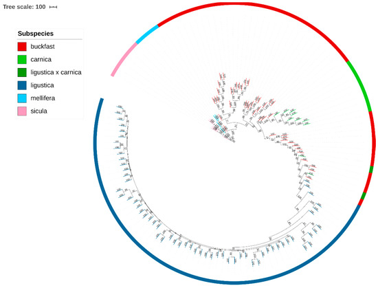 A phylogenetic tree of all the samples based on the filtered dataset of 44,811 SNPs is shown in Figure 4. Results display a clear concordance of the clustering identified previously by PCA analysis (Figure 3). The A.m. sicula and A.m. mellifera samples create two initial clearly separated branches. By contrast, the subspecies of group C are phylogenetically closer, and show a common root. Furthermore, a detailed analysis of the different branches of the tree that correspond to the Buckfast bees indicates that the Buckfast samples are split into four branches. The information provided by beekeepers allowed us to identify a possible explanation: the breeder of origin. Indeed, the samples forming the four branches correspond to four different breeders of origin. The first Buckfast group descended from a Luxemburg breeder. The second and the third groups have Danish and Austrian origins, respectively, whereas the fourth group is from a German breeder.