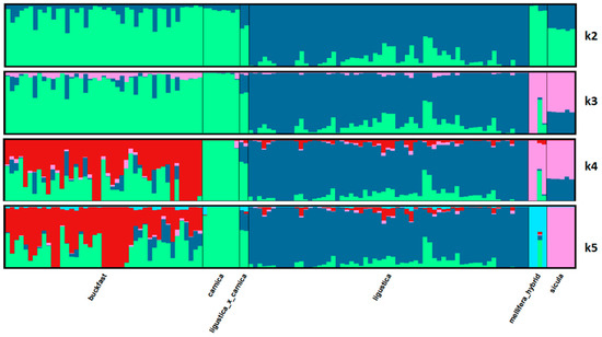 Lastly, referring to the 2 Ligustica × Carnica hybrid bees, results of Admixture analysis confirmed PCA and phylogenetic results, allowing us to clearly disentangle the samples as Carnica × Ligustica crosses. In general, all results of Admixture confirmed PCA and phylogenetic results.