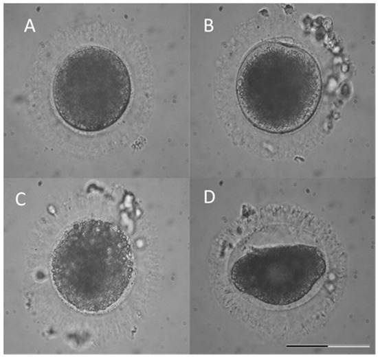 Morphological appearance of the oocytes after warming and IVM. Classified as: (A) Normal oocyte, (B) normal and mature oocyte, (C) oocyte with damaged membrane, and (D) shrunken oocyte. Scale bar = 100 µm.