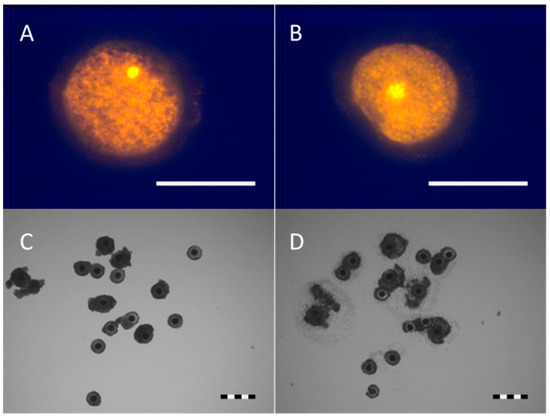 Oocytes stained with propidium iodide are shown on a fluorescence microscope (A), a GV, and (B) an early GVBD, scale bar = 100 µM. Oocytes frozen in titanium tubes (C) before and (D) after IVM, scale bar = 500 µM.