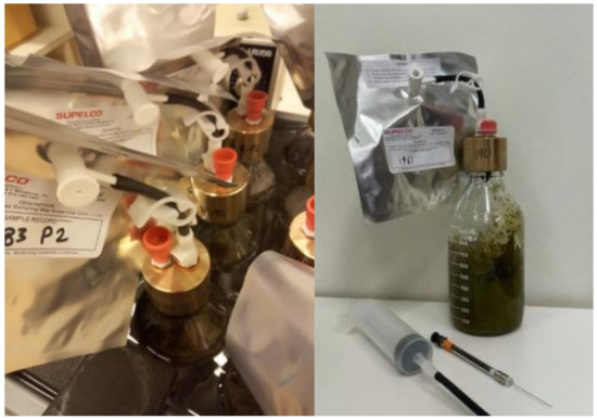 To estimate CH4 emissions from feces after nine weeks of incubation, a modified version of the in vitro method described by Ramin and Huhtanen [11] was used. In the modified version, one liter bottles were used and that total gas (cumulative) was recorded manually with a syringe. A small portion (15 g) of the feces was also stored and kept at −80 °C for later microbial analysis. Fresh feces (400 g) from each cow (pooled sample) were placed in 1-L serum bottles connected to gastight bags (SupelTM-Supelco) and incubated at 39 °C for approximately nine weeks (Figure 1). We used 39 °C since it is a standard temperature used for in vitro studies and to speed up the fermentation procedure to estimate potential CH4 emissions from feces. Incubations were carried out at the end of each period (1 to 4). The GreenFeed method was used to measure enteric CH4 emissions (GreenFeed system, C-Lock Inc., Rapid City, SD, USA), as described by Huhtanen et al. [12]. Methane from feces was measured by sampling the gas in the gastight bags on days 1, 4, and 7 and then every week over the nine weeks. Cumulative CH4 emissions were then computed. Methane emissions at each time point were calculated as: