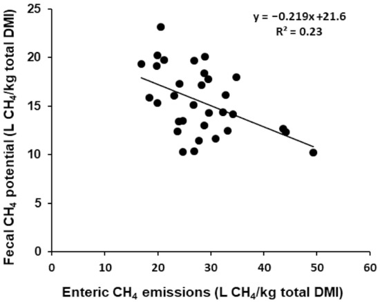 Relationship between enteric CH4 emissions and maximum CH4 emissions potential from feces (n = 32). Fecal CH4 potential was predicted from VFA (mM) stoichiometry, based on VFA determined for the samples and the buswel CH4 potential coefficients taken from Lima et al. [18].