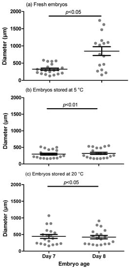 Diameter of fresh embryos. (a) collected on day seven (E7F) and day eight (E8F) after ovulation, and before (d7) and after 24 h (d8) short-term storage at (b) 5 °C (E5C) and (c) 20 °C (E20C). Each dot represents a single embryo. The plot represents the descriptive variation (mean ± S.E.M.) within the group. Significant differences are indicated in the figure.