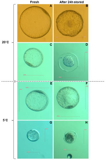 Assisted reproduction techniques (ART) in horses have considerably advanced during the last decade. In this field, artificial insemination along with embryo transfer are still the most common ART applied to horses []. The production of embryos by ovum pick-up and subsequent intracytoplasmic sperm injection, however, is attracting increasing attention. Because of a limited availability of recipient mares at facilities that collect fresh embryos, or produce in vitro embryos, the shipment of such embryos is required with increasing frequency. Similarly, techniques that require specific laboratory equipment, such as cryopreservation, or require preimplantation genetic diagnosis, often demand overnight transport and sometimes transport back thereafter [,]. Equine embryos are transferred at day seven or eight after ovulation [,], with the majority developed to the blastocyst stage at the time of transfer []. For overnight transport, embryos are either cooled to 5 °C or kept at room temperature []. Therefore, transportation is a critical issue that can contribute to success or failure of subsequent embryo transfer.