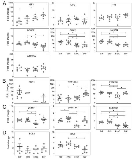 Relative mRNA expression levels of genes related to: (A) growth and development, (B) embryo-maternal communication, (C) methylation, and (D) apoptosis in fresh control (E7F and E8F) and stored embryos (E5C and E20C). E5C and E20C either did not express ESR1 or did not have enough samples; therefore, values were not considered for statistical comparison. Each dot represents a single embryo. The plot represents the descriptive variation (mean ± S.E.M., n = 6) within the group. Fold-changes were calculated with the comparative 2−ΔΔCT method (* p < 0.05).