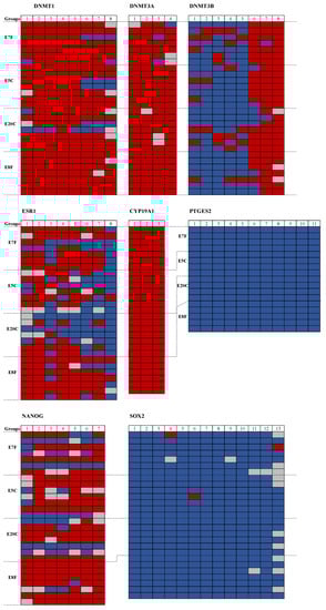 Overview of DNA methylation results of single CpGs for the selected genes. DNA methylation (DNMT1, DNMT3A, DNMT3B), embryo-maternal recognition (ESR1, CYP19A1, PTGES2), and growth and development (NANOG, SOX2) of the equine embryo. Blue box, unmethylated CpG; red box, methylated CpG; gray box, unclear methylation state. One row refers to one embryo and the number of columns refers to the number of CpGs sequenced in the CG-rich region (methprimer CpG island finder) upstream of the gene (Table 2).