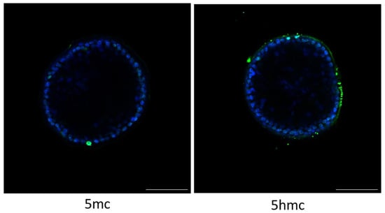 Illustrative image of 5mC and 5hmC immunolabeling in equine stored embryo at 20 °C after 24 h. Equine embryos had similar 5mC and 5hmC immunolabeling among treatments. Green labeling represents methylated stained cells. Blue labeled cells are stained with DAPI to allow the identification of the embryonic cells and permit the quantification of global methylation. Scale bar, 100 µm.