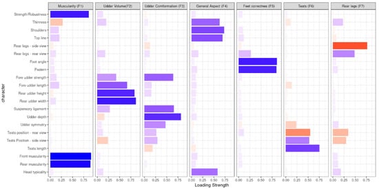 Factor analysis for all the morphological traits was carried out to reduce the number of traits and avoid redundant morphological measurements (see also Data Editing section). The traits included in the analysis are described in Table 1. The factor analysis was performed using the “psych” package of R []. The varimax rotation method was used []. Latent variables with eigenvalues ≥ 1 were retained for further analysis. The factor score originated from every latent variable was considered as a new trait. According to traits of main interest expressed by the national breeders’ association, only three of seven latent factors were considered for subsequent analyses. They were called Factor 2 (F2), corresponding to udder volume; Factor 3 (F3), that is udder correctness, and Factor 7 (F7), rear legs (Figure 1). Together with these factors, the subsequent analysis also included the linear scores for rear muscularity (RM) and head typicality (HT), respectively considered as a beef trait and a functional trait for the breed.