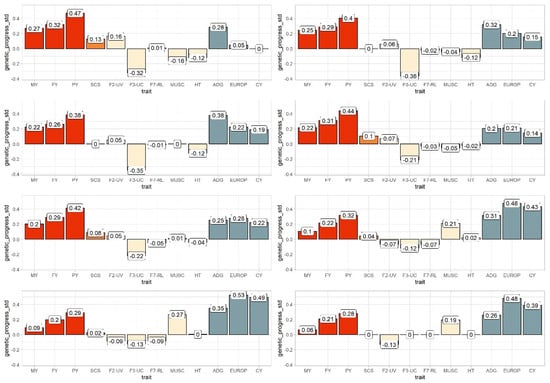 Standardized genetics progress (y axes) for 12 traits studied considering 8 different scenarios (from S1 to S8) attributing different weights to specific traits in the possible selection index. Red bars represent milk, fat, and protein, orange bars SCS, light-yellow morphological traits (both factors and single trait analyzed), and grey bars beef traits (type rear muscularity or performance test traits). Traits’ abbreviations are reported in Table 1.