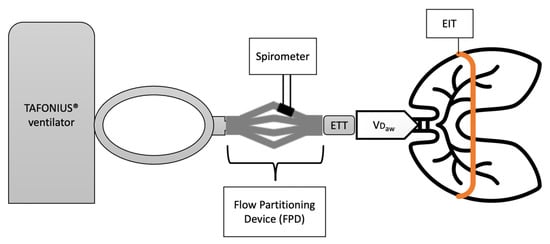 It is important to highlight that spirometry and EIT operate at different levels (Figure 1). Spirometric measurements are taken proximally, at the level of the incisors, and comprise the volume in the endotracheal tube and conducting airways where gas exchange does not occur (equipment and VDaw). In contrast, EIT represents a cross-sectional area of the lungs taken at the level of the 5–6th intercostal space and is unaffected by equipment and VDaw. Dead space volumes can be derived from volumetric capnography (VCap). Volumetric capnography plots the expired CO2 concentration over the exhaled volume of a single breath and uses Fowler’s method to calculate VDaw and VTalv [,]. For large animal applications, volumetric capnography and spirometry measurements are made possible by a flow partitioning device (FPD) [,,].