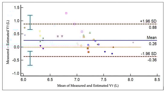 Another limitation of the study is attributed to the use of the FPD. The FPD enabled the application of standard human spirometry to large animal anaesthesia in a simple and reproducible way. Previous research supported the use of FPD paired with a commercially available spirometer as an accurate and reliable way to measure tidal volume in anaesthetised horses, therefore this method was chosen for this study as the reference method [,]. The downside of using an FDP is that a correction factor of 4 is required for volume measurements []. Applying the correction factor also causes the measured error to be multiplied by 4.