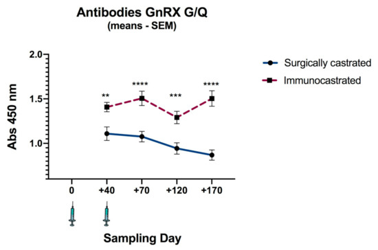 28. Janett, F.; Gerig, T.; Tschuor, A.; Amatayakul-Chantler, S.; Walker, J.; Howard, R.; Bollwein, H.; Thun, R. Vaccination against gonadotropin-releasing factor (GnRF) with Bopriva significantly decreases testicular development, serum testosterone levels and physical activity in pubertal bulls. Theriogenology 2012, 78, 182–188. [Google Scholar] [CrossRef][Green Version]