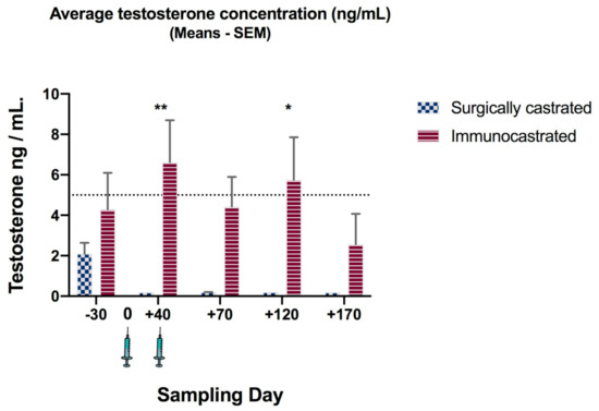 Figure 2. Average testosterone concentration (ng/mL) for Norman × Hereford bulls surgically castrated (SC) and immunocastrated (IC). Superscripts indicate significant difference (p-value: * < 0.05; **< 0.01).