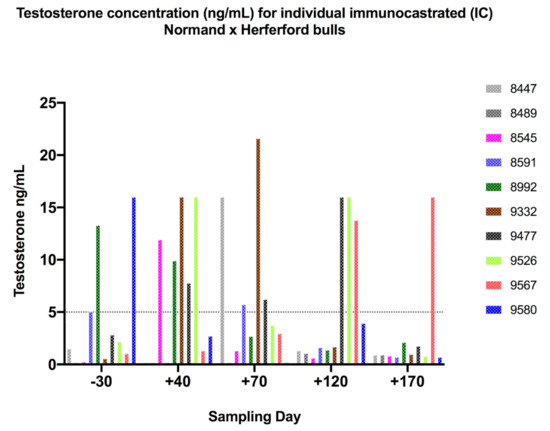 Figure 3. Individual testosterone concentration (ng/mL) for 10 immunocastrated (IC) Norman × Hereford bulls. Each color represents one bull sampled at various time points pre- and post-vaccination from Day −30 to Day 170.