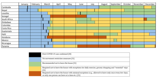 First confirmed COVID-19 case and associated movement restrictions across the 14 countries involved in the survey, incorporating data from Worldometer (first confirmed case) and Our World in Data (movement restrictions) [30,31].