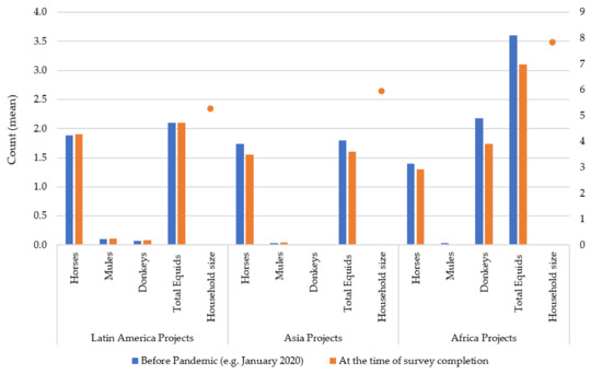 Similar to FAOSTAT 2019 data, in this study, there is a larger proportion of donkeys owned in Africa vs. America and Asia [36]. However, donkeys and mules are under-represented in this study amongst all groups compared to FAOSTAT data [36]. Linking the number of equids owned with the household size, overall, this study found that a median of two equids support a median household size of five across the study population, therefore, a ratio of 2.5 people relying on 1 equid. There are regional differences, but as a whole, it shows that if an equid dies, is off work, or has decreased productivity due to an injury or sickness, the day-to-day lives/livelihoods of 2.5 people may be affected.