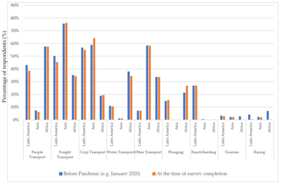 There were differences in the types of work undertaken by equids on a community, country, and regional basis. Such differences have not previously been documented in all of the countries involved in the survey. Working equids are involved in multiple tasks in the livelihoods of humans [9,12,20], and this study further emphasises their pivotal involvement. While the equids in this study are seeing decreased workloads, the type of work they are doing has not changed substantially in the short term. This could be due to the variable topography and equipment available, which may restrict the different tasks a working equid is able to do in individual settings in the short term. In Latin America, there were small decreases in equids being used for people transport, freight transport, crop transport, and racing (Figure 3). In Africa, the small number used for tourism and racing decreased, there was also a small decrease in percentage used for water collection, while there was an increase in ploughing (Figure 3). In Asia, there was a decrease in people transport and an increase in crop transport (Figure 3). Some of these small changes are not surprising with seasonal changes (Supplementary Items S4), the movement restrictions imposed due to the pandemic (Figure 1) [31], and the closure of markets, and restrictions on domestic and international travel (Supplementary Items S4).