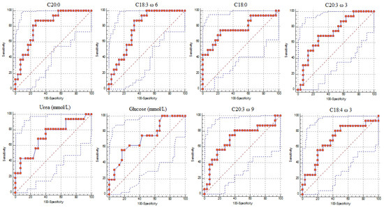 Among biochemical parameters, glucose and urea were recognized as possible biomarkers, presenting an AUC equal to 0.72 and 0.73 respectively. Furthermore, the significant milk fatty acids were analyzed for a receiver operating curve (ROC) to identify potential biomarkers (Table 3). Five milk fatty acids (C18:1 ω 9, AUC = 0.67; C18:3 ω 3, AUC = 0.65; C20:5 ω 3, AUC = 0.68; C24, AUC = 0.68; C24:1ω9, AUC = 0.64) presented an AUC lower than 0.70, consequently they were not considered as predictive biomarkers. Six milk fatty acids (C20:0, AUC = 0.82; C18:3 ω 6, AUC = 0.78; C18:0, AUC = 0.77; C20:3 ω 3, AUC = 0.73; C20:3 ω 9, AUC = 0.71; C18:4 ω 3, AUC = 0.70) presented an AUC higher than 0.70, thus they were identified as accurate and potential biomarkers. These milk fatty acids showed a significant increase in hyperketonemic animals establishing different cut-offs with a confidence interval of 95% (9.65 mg/dL; 7.07 mg/dL; 465.31 mg/dL; 0.45 mg/dL; 2.07 mg/dL and 3.37 mg/dL, respectively).