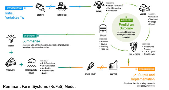Managing the need for sustainable food production requires a careful allocation of limited farm resources. One method to guide policy, support farm decisions, and evaluate novel technologies is the use of simulation models. The effect of implementing new technologies on-farm or changing production management can be evaluated on multiple outcomes, generally providing a more robust evaluation than traditional research experiments. Existing whole-farm models for dairy production include the Integrated Farm Systems Model [7], DairyMod [8], DyNoFlo [9], and SIMS(DAIRY) [10], but these models have limitations that prevent their wide-scale applicability in current and future scenarios. Incorporating vast amounts of data from farm records or adapting to new technologies is often impossible with existing models due to the model structure or restrictions in the model code. Thus, we saw the need to develop a new farm simulation model that can adapt to changing technologies and support sustainable dairy production [11]. The Ruminant Farm Systems Model (RuFaS, Figure 1) incorporates modern computer coding practices centered around clarity and adaptability to respond to evolving technologies in the dairy industry. RuFaS embraces the key characteristics for next-generation agricultural systems models described by Jones et al. [12]: “technological advances; open, harmonized data; transdisciplinary collaboration; modularity and interoperability; user-driven data and model development”.