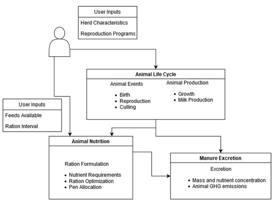 The animal module simulates the individual animal from birth to culling, accounting for farm management decisions and individual animal responses to those decisions. Animals are simulated individually, and outputs such as animal growth, animal production, and manure production are estimated daily for each animal. The main routines of the animal module are the animal life cycle, animal nutrition, and manure excretion (Figure 2). The animal management class manages the animal routines—performing the algorithms to account for all animals and animal classes in the simulation.